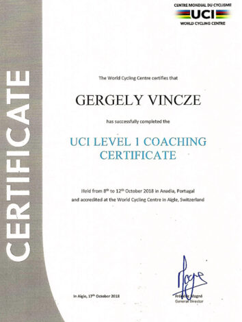 Vincze Gergely 2018. október 7-12.között részt vett a UEC és a Portugál Kerékpáros Szövetség által Anadiaban szervezett BMX edző alap képzésen és sikeres vizsgát tett.