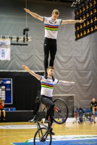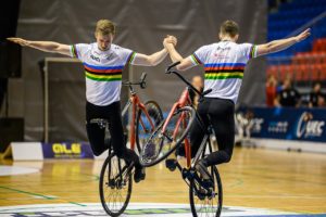 A belga Manon Geldof volt az első, aki parkettre léphetett a Continental Arénában a művészi kerékpározás női egyéni számában, majd két szlovák és egy cseh versenyzőt követően a Magyarország-Ausztria mérkőzéssel indultak a kerékpárlabda eseményei. Az Árendás Tamás-Toma Vilmos párosnak nem volt könnyű dolga a bombaerős riválisokkal szemben, így végül a papírformának megfelelően, hatalmasat küzdve, de mindhárom mérkőzésüket elvesztették.