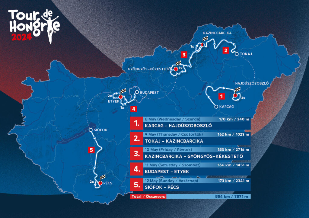 - A 854 kilométeres versenytáv alatt 7871 méternyi szintemelkedést kell leküzdeniük a versenyzőknek – ez a világ huszadik legmagasabb hegycsúcsának felel meg. A Tour de Hongrie 2015-ös visszatérése óta egy kiadás sem tartalmazott még ennyi szintemelkedést.