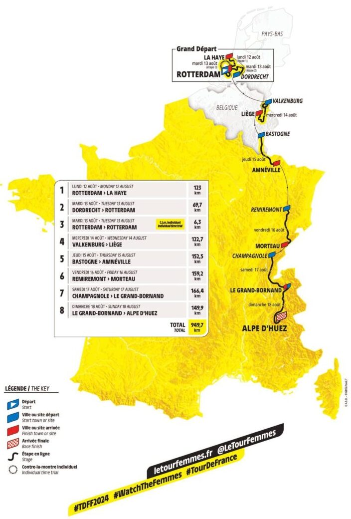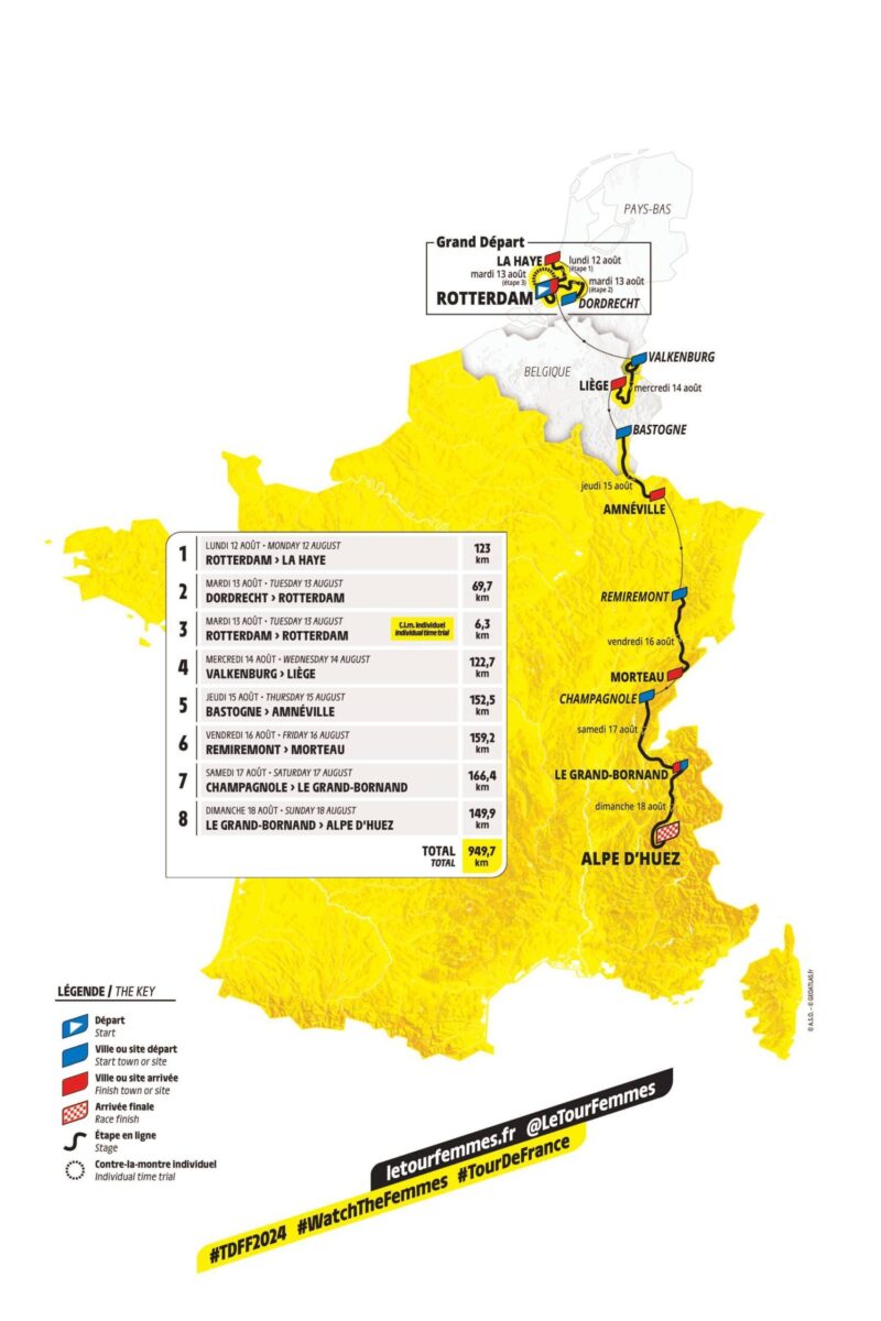 A nyolcszakaszos megméretés hétfőn Rotterdamban kezdődik és jövő héten vasárnap a legendás Alpe d’Huezen zárul. A hét versenynapba úgy fér bele a nyolc etap, hogy kedden egy rövid, mintegy 70 kilométeres mezőnyszakaszra és egy 6,3 kilométeres egyéni időfutamra is sor kerül.
